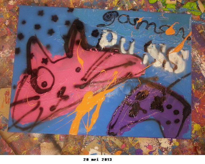 Het advies werd gegeven om niet vijftien kleuren te gebruiken, maar het bij 3 tot 4 kleuren te houden. Een goede tip, want het dwingt je om goed na te denken over welke kleuren bij elkaar passen en ondanks dat het nogal chaotische drukke schilderijen zijn, zit er dan toch een bepaalde rust in waardoor het prettig blijft om naar te kijken. Ik koos paars, roze, blauw en oranje en begon lekker chaotisch een poes en een gamecontroller op het doek te zetten. Tot slot, tijdens het wachten op mijn vriend, nog even wat luipaardprint erbij gespoten met een sjabloon en klaar is kees. Je hebt het razendsnel gedaan, maar het duurt wel een tijd voordat de acrylverf droog is.