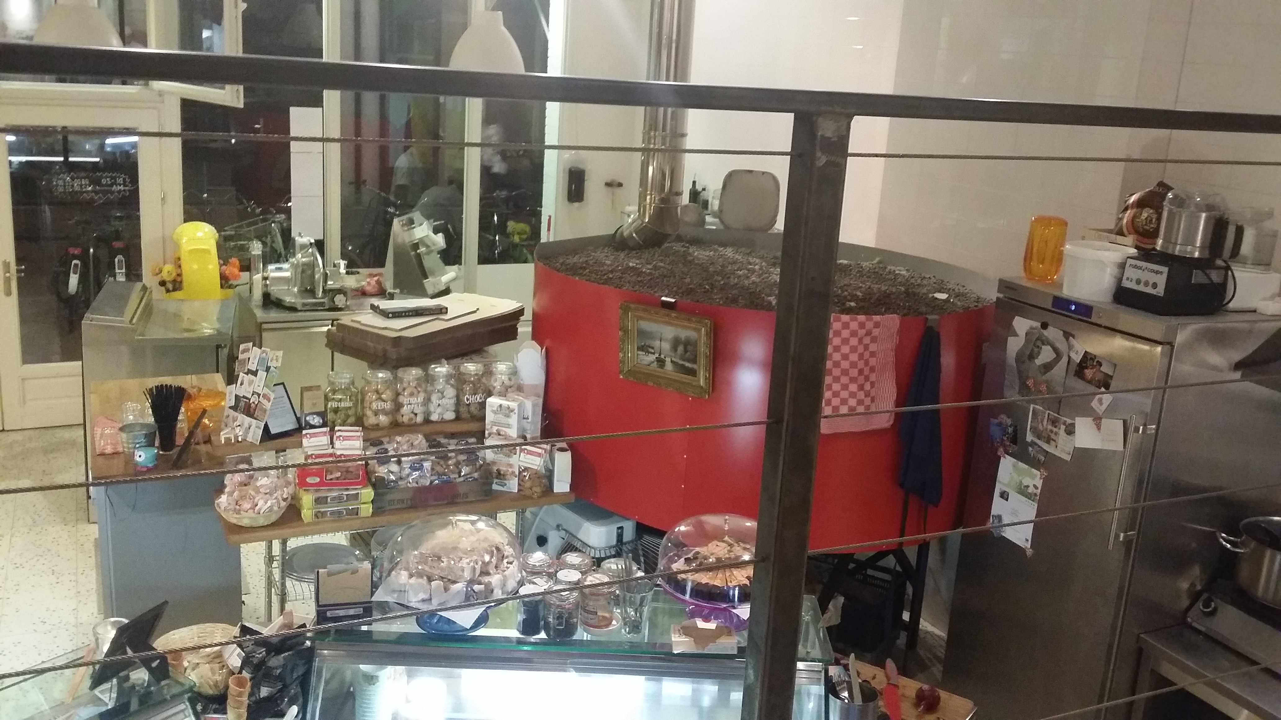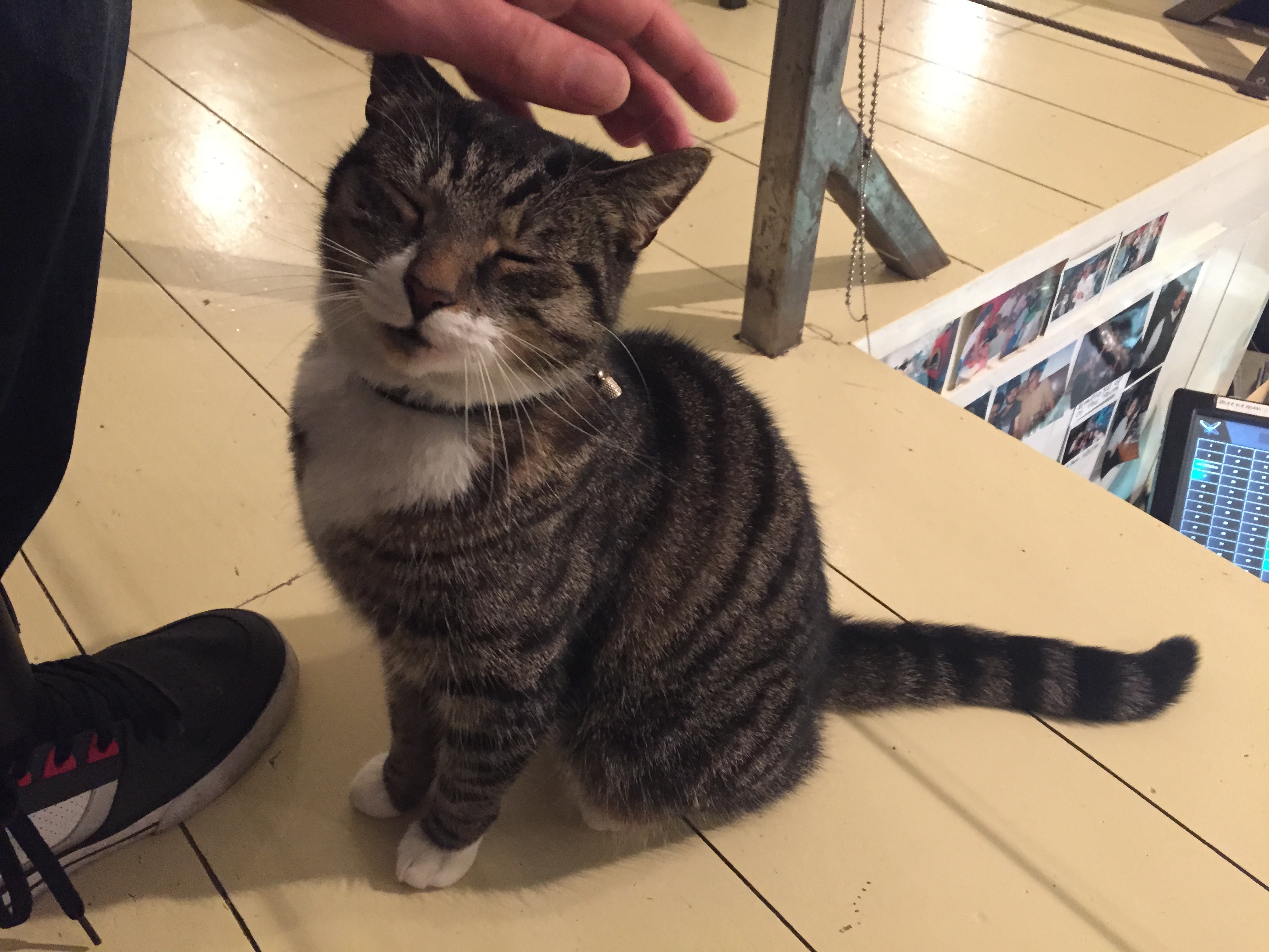 PS: we waren erg gecharmeerd van een poesje dat in de zaak rondscharrelde. Ontzettend gezellig om zo’n viervoetertje langs je benen te voelen knuffelen. Ik weet dat sommige mensen het niet zo waarderen als er dieren tussen hun eten rondlopen, maar voor mij draagt het bij aan een gezellige, huiselijke sfeer. Zeker als de poes in kwestie zo lieflijk is als deze: