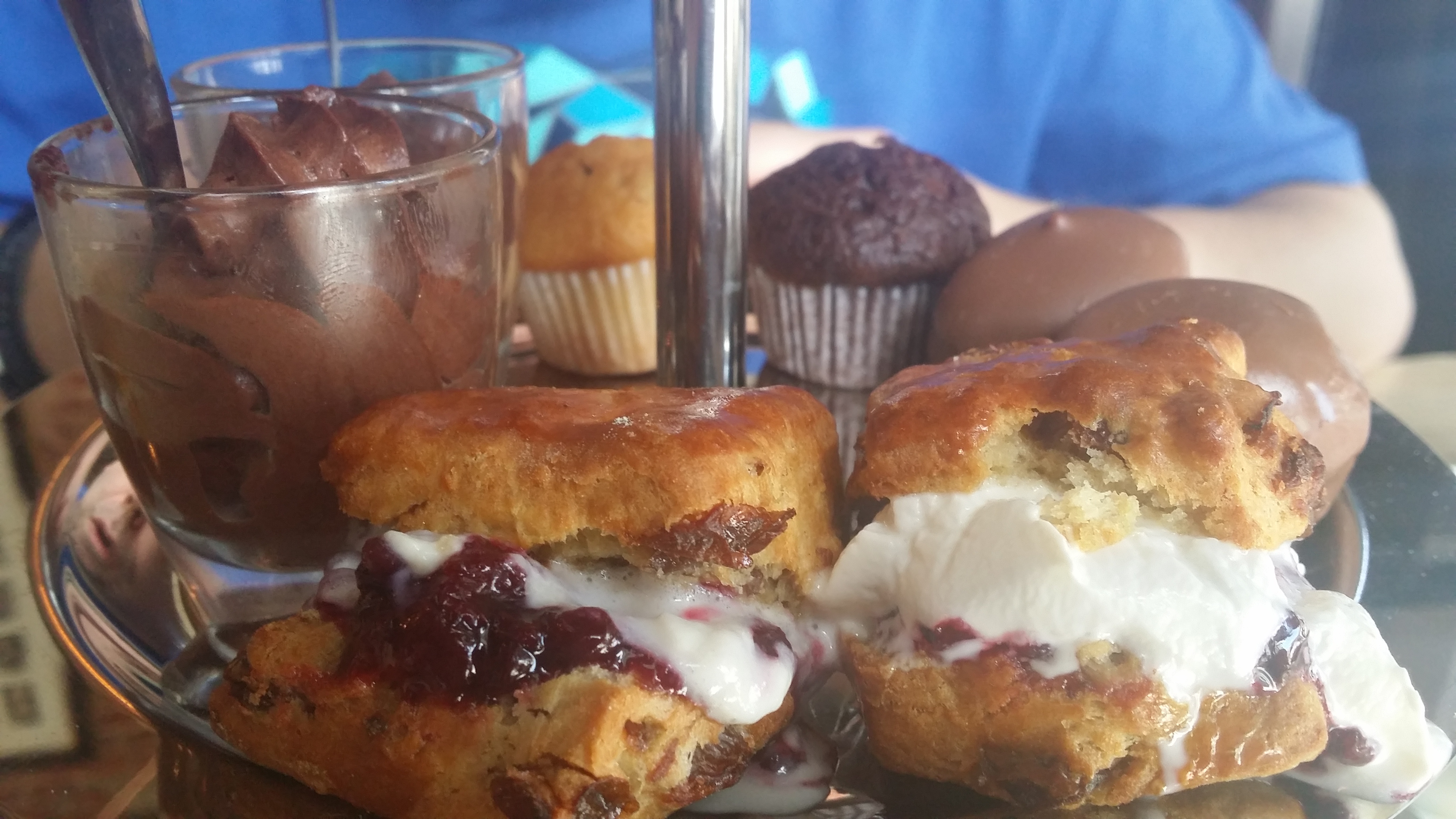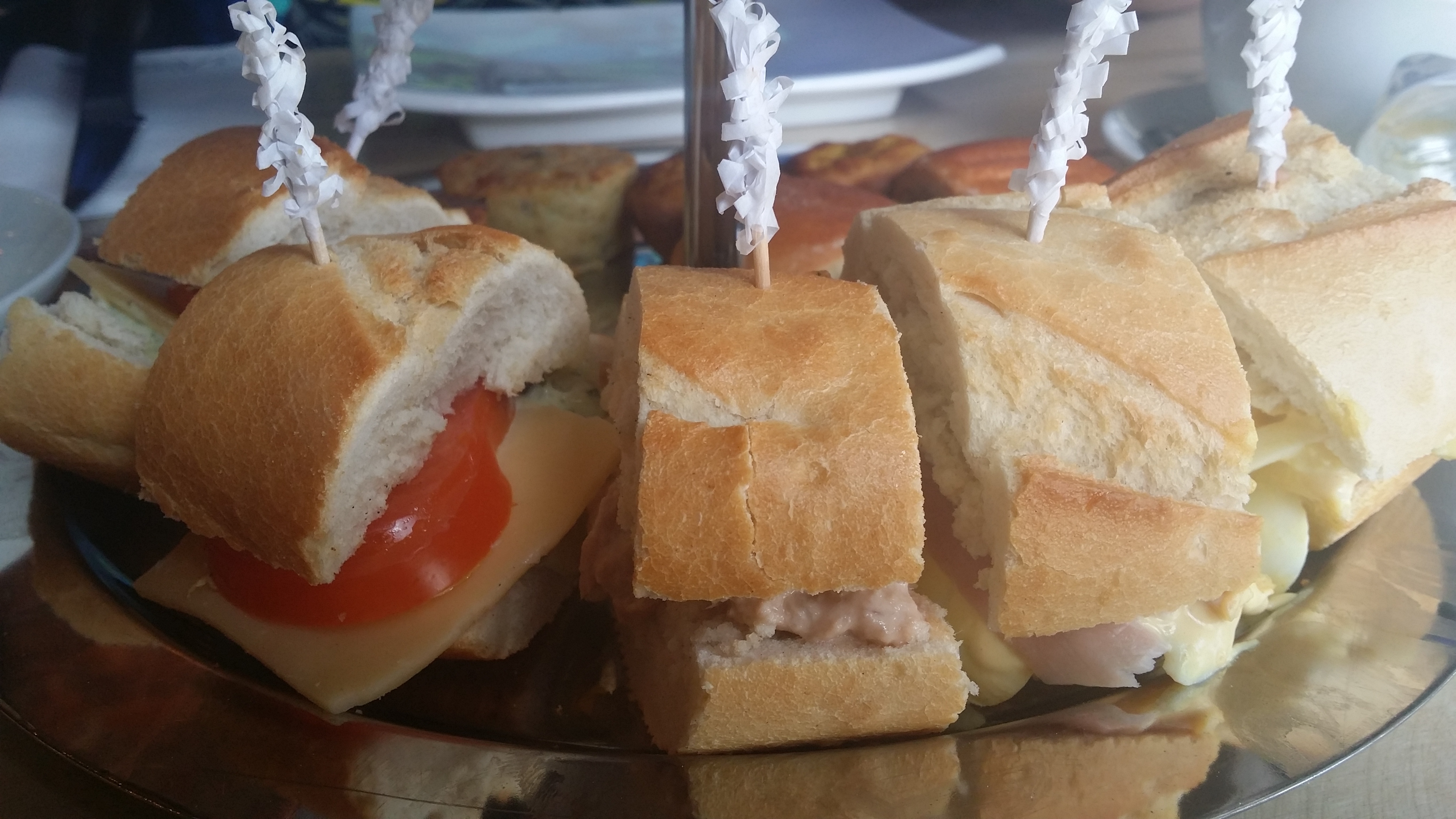 Wat ik heel mooi vond, was de mooie opbouw van hartig en warm naar zoet en koud. Het meest charmant waren echter de mini-worstenbroodjes, want dat is natuurlijk heel Brabants en dat was een leuke touch. Verder waren er stokbroodjes met kaas en basilicum, met tonijnsalade en met ham en eiersalade. Er waren miniquiches met garnalen, een mini-pasteitje met kerrie en een etage daarboven werd het zoet. Daar lagen de scones, echt met rozijnen, die zeer smakelijk waren. Ook waren daar chocoladesoesjes, die mijn vriend heel schattig ‘mini Bossche Bollen’ kroonde. De mini-muffins waren fabrieksmuffins, maar de chocolademousse was wel zelfgemaakt en had een zeer rijke chocoladesmaak.