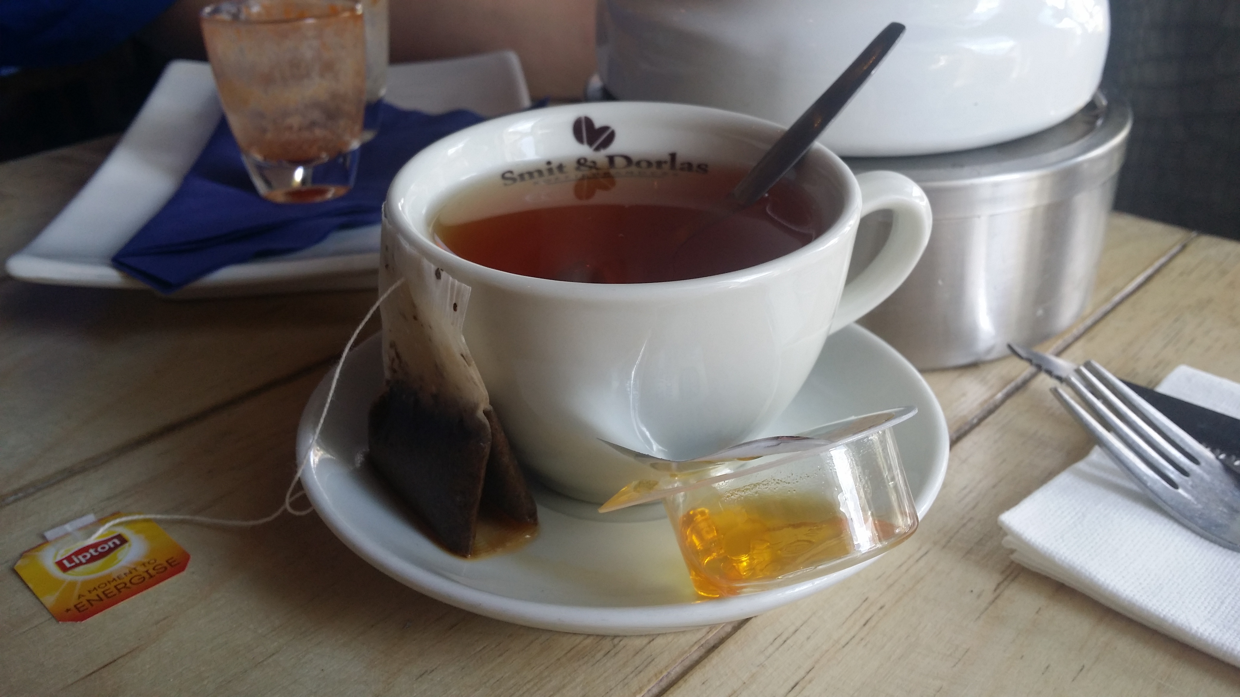 Ondertussen konden we net zoveel potten gekookt water krijgen als we wilden, waarvan we dan met Lipton theezakjes thee konden zetten. Ik heb me helemaal wezenloos gedronken, want in het warme zomerweer moet je goed hydrateren natuurlijk. Het was ook heel erg lekker, want ik had wat honing in de thee en de serveerster gaf ons netjes tijd tussen de soep en de etagere. Maar toen die etagere kwam, had ik er ook wel heel veel zin in gekregen. Aan de foto’s in dit stuk kun je waarschijnlijk al zien waarom; de hapjes waren allemaal van goede kwaliteit.