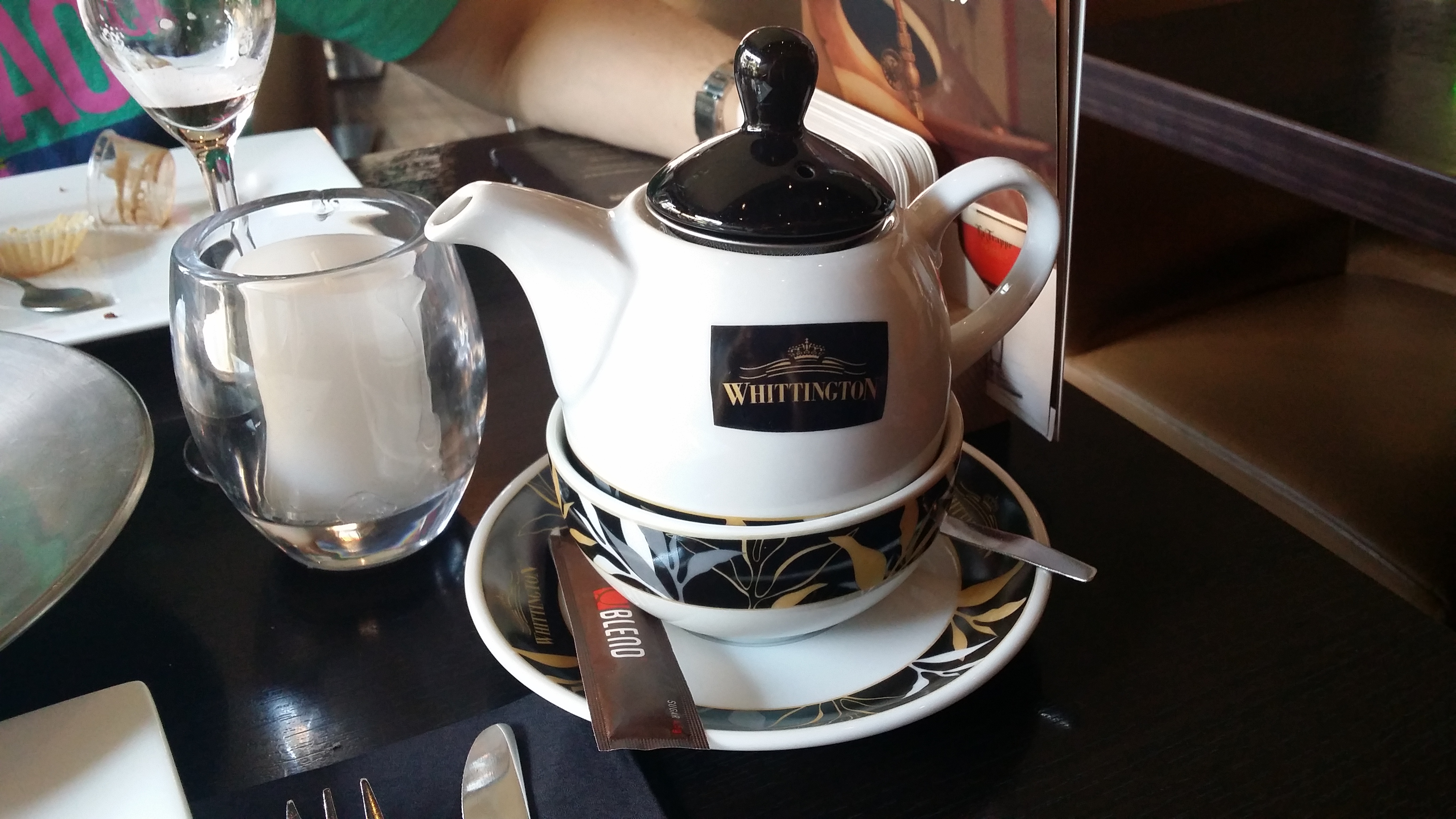 Terug naar de thee! We mochten elk een smaak thee van Whittington uitzoeken, die erg schattig werd gepresenteerd in een klein theepotje dat precies in het kopje paste. Wilde je meer thee, dan kon dat, maar het was erg warm buiten dus we hadden aan de twee koppen die er uit het potje kwamen wel genoeg. Ik was erg blij om te zien dat het losse thee was, want het was zeer smaakvol (de Green Forest was onze keuze). Nog voordat de thee werd gebracht, kregen we de etagere vol lekkers al op tafel. Deze high tea bevat geen soep, maar dat stond ook niet omschreven in de veiling.