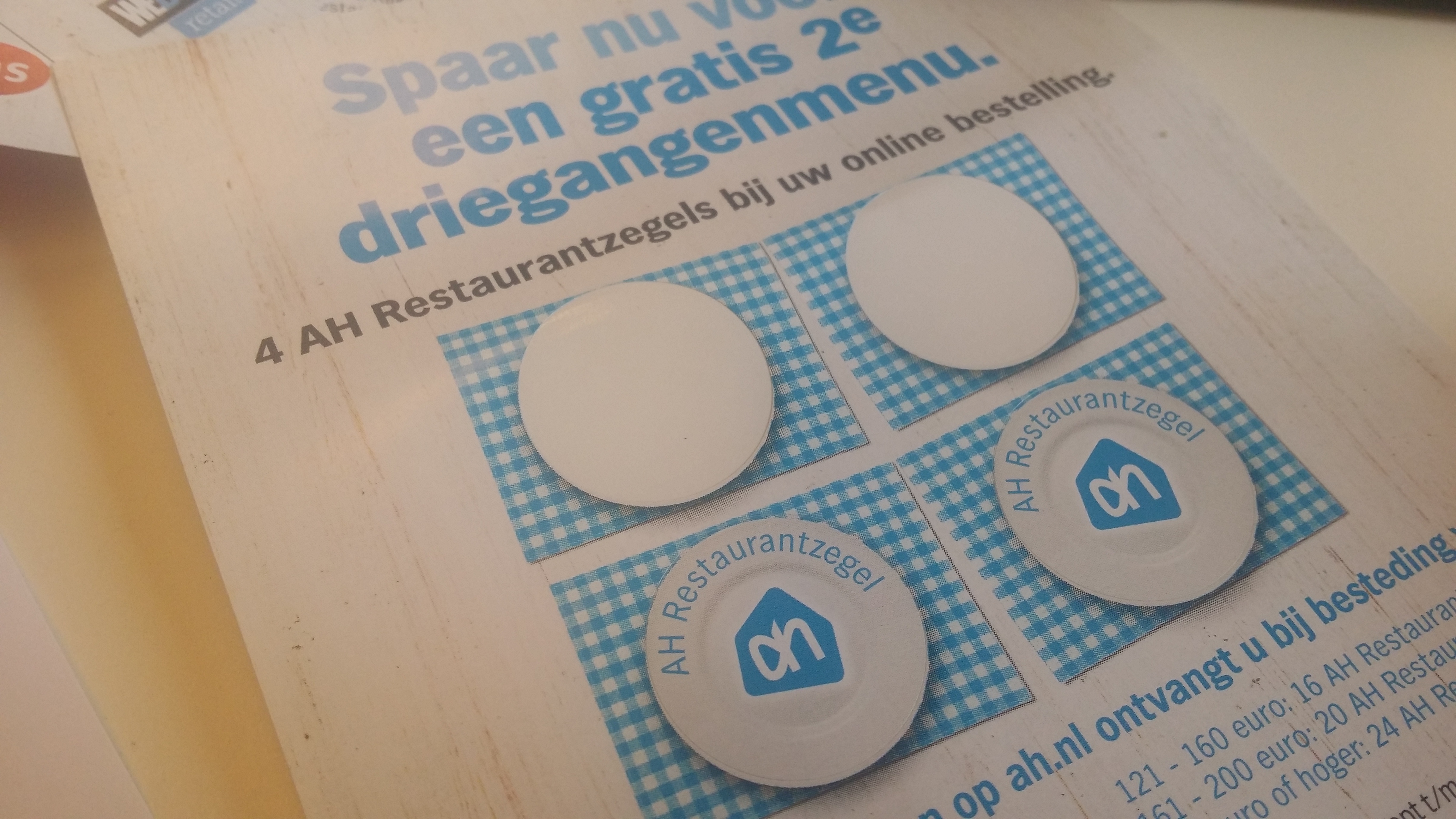 Het grappige is dat er binnen de supermarktwereld best veel kritiek is op de actie, immers kannibaliseert Albert Heijn door mensen een avond uit eten te laten gaan. Wie uit eten gaat doe geen boodschappen… Maar wie uit eten wil en de tweede persoon een gratis drie-gangenmenu wil aanbieden, die zal wel veel boodschappen moeten doen. Ik geloof dat je 100 euro aan boodschappen moet hebben om een hele kaart vol te hebben (10 keer 10 euro aan boodschappen dus). Dat lijkt heel veel, maar dat heb je zo bij elkaar. Ik verbaas me enigszins over hoe lang de actie loopt. Niet alleen krijg je iets van een maand lang zegels (of stickers eigenlijk), je kunt ze ook enorm lang inwisselen bij restaurants. Tot 31 januari 2016 kun je reserveren bij zeer goede, leuke en ook enkele matige restaurants in Nederland.