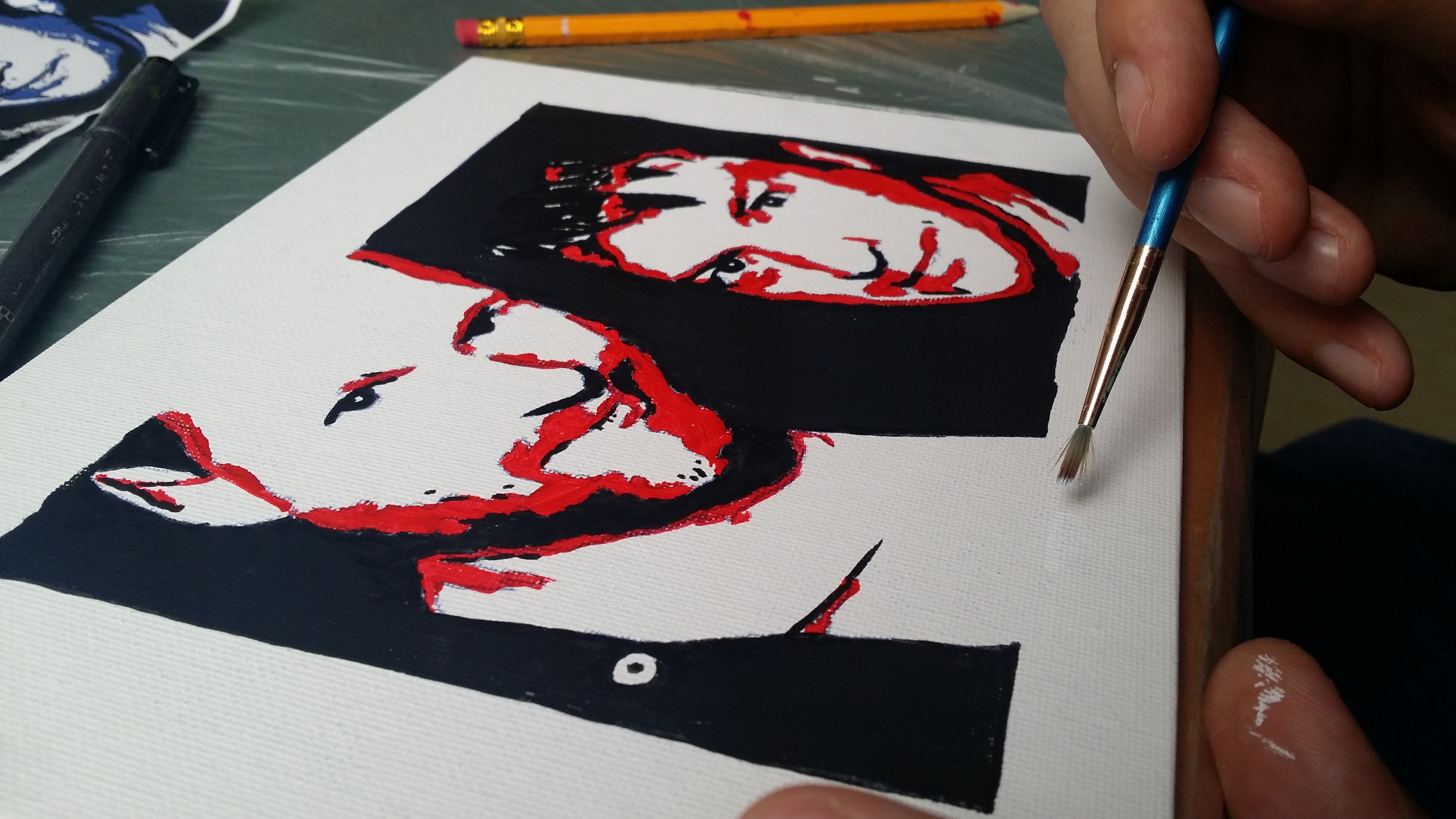 Eerst plakten we een carbonpapiertje met daarbovenop een geprint A4 met de opgestuurde foto in een gek pop-arty contrast. Vervolgens moesten we met potlood langs de lijnen gaan, om zo het portret op het schilderijtje te krijgen. Daarna schilderden we eerst felgekleurde vakken, toen zwarte vlakken en als er nog tijd was dan konden de witte vlakken ook met een lichte kleur worden gedaan, maar daar zijn we niet aan toegekomen.