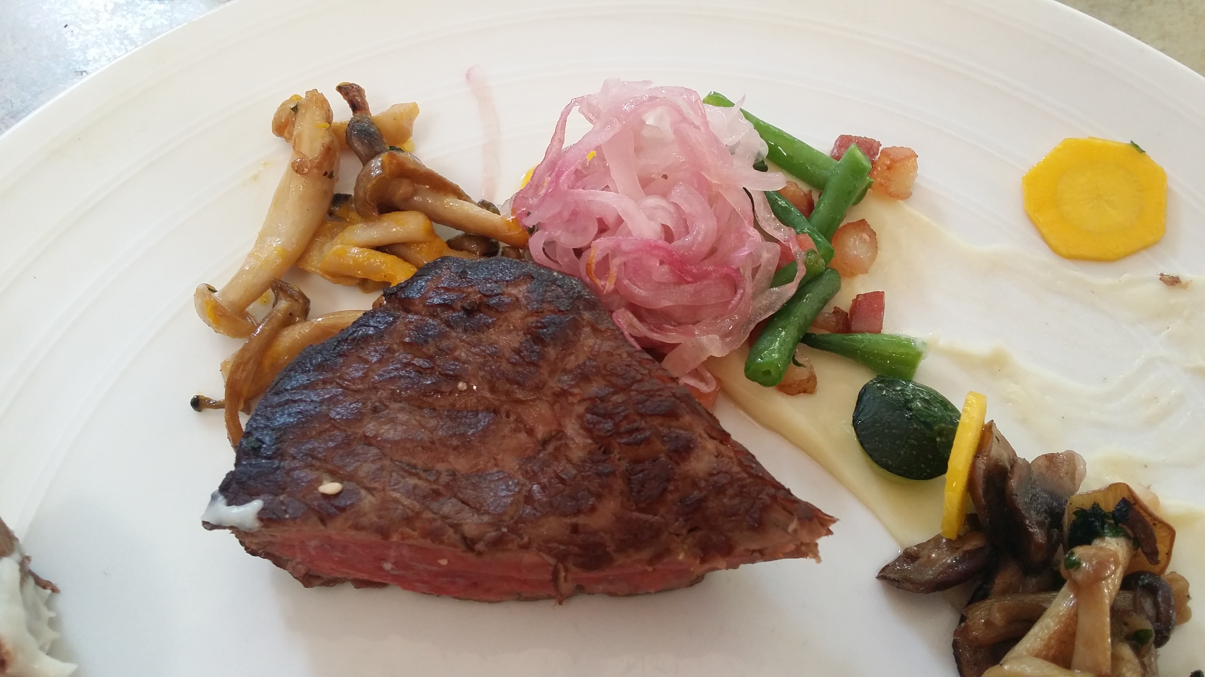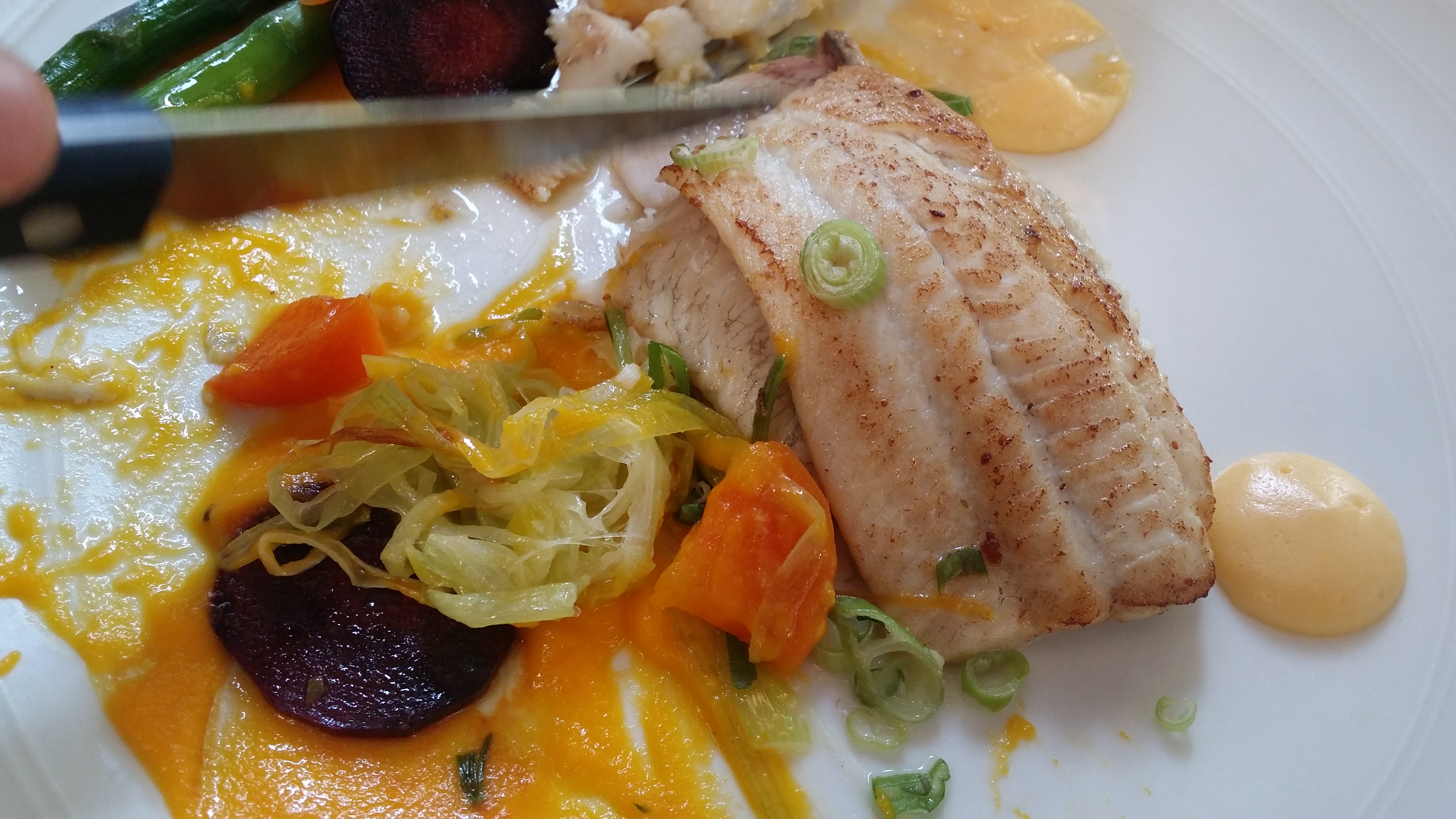 Maar goed, het is een hele goedkope actie natuurlijk, de AH Restaurantactie, dus we gingen vrolijk verder naar het hoofdgerecht. Beetje raar, want dat kregen we zodra onze carpaccio-borden waren weggehaald meteen geserveerd. Vreemd tijdsbestek, maar we waren blij want we hadden nog andere dingen te doen die avond. Het hoofdgerecht, dat moest het hoogtepunt worden, want ik zag die dame blanche niet zo zitten. Ik had de biefstuk, partner in crime de vis. Beide gerechten waren erg mooi gepresenteerd, met een mooie streep saus en bijzondere kleurrijke groenten. Het vlees en de vis waren lekker, vooral in combinatie met de friet, want de frieten waren heel erg lekker.