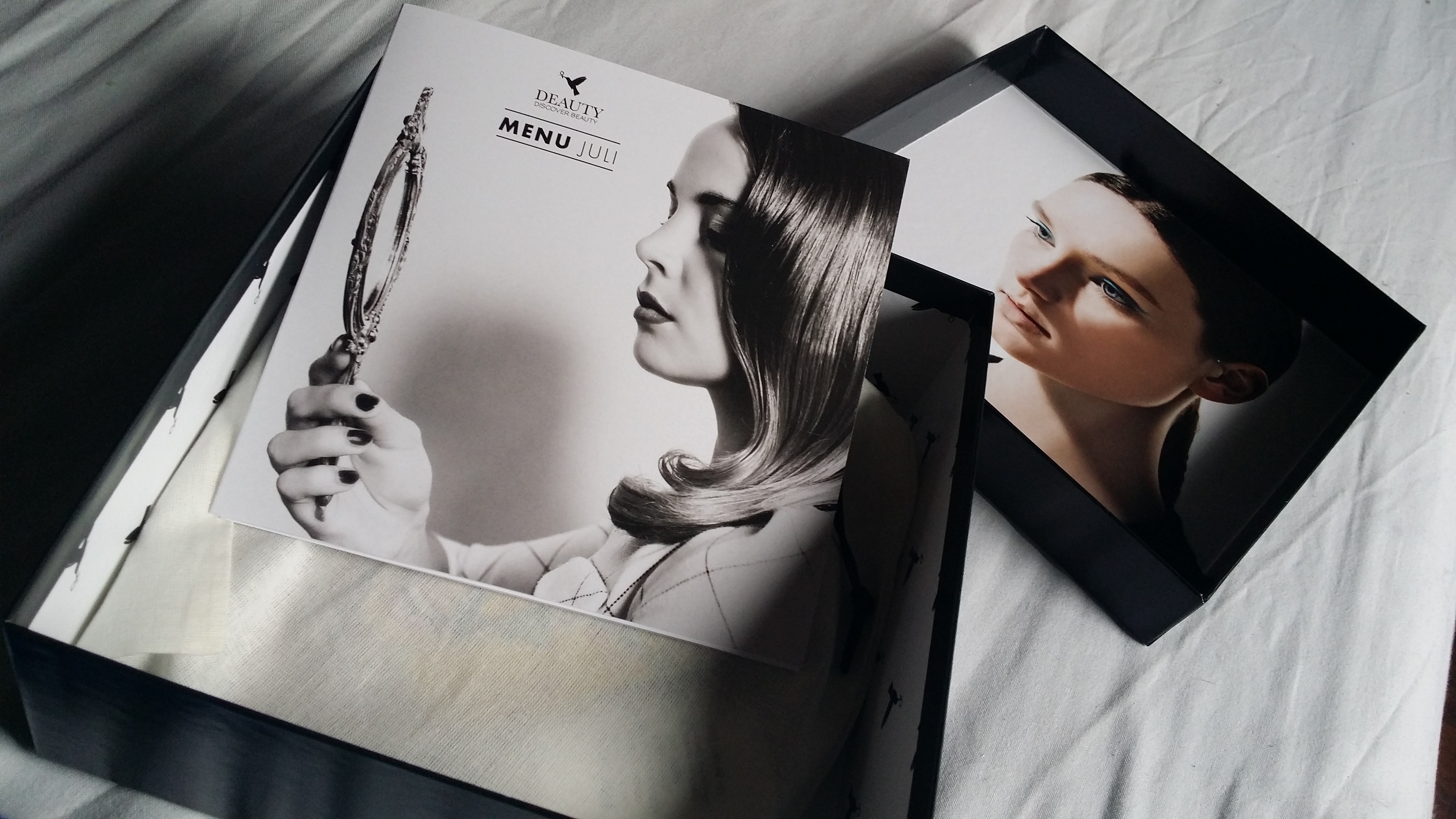 Goed, het kwaad was al geschied dus ik ga nu de juli Deauty box bespreken! Wat me ten eerste al opviel was dat er een menu bij zit. In dat menu kun je meer informatie lezen over de producten die er die maand inzitten, plus de adviesprijs mocht je het volledige product willen kopen. Er staan ook belangrijke tips in die ik bij de VakantieVeilingen-box ook had kunnen gebruiken. Bijvoorbeeld over primer, hoe dat eigenlijk werkt. Wat me enorm opviel bij deze box was dat hij veel minder veelzijdig was dan die van VakantieVeilingen. Ik zou zelfs kunnen stellen dat ze zich er bij Deauty een beetje makkelijk vanaf maakten. Als deze box representatief is voor wat de Deauty-box maandelijks brengt, dan zou ik daar geen lid van worden.