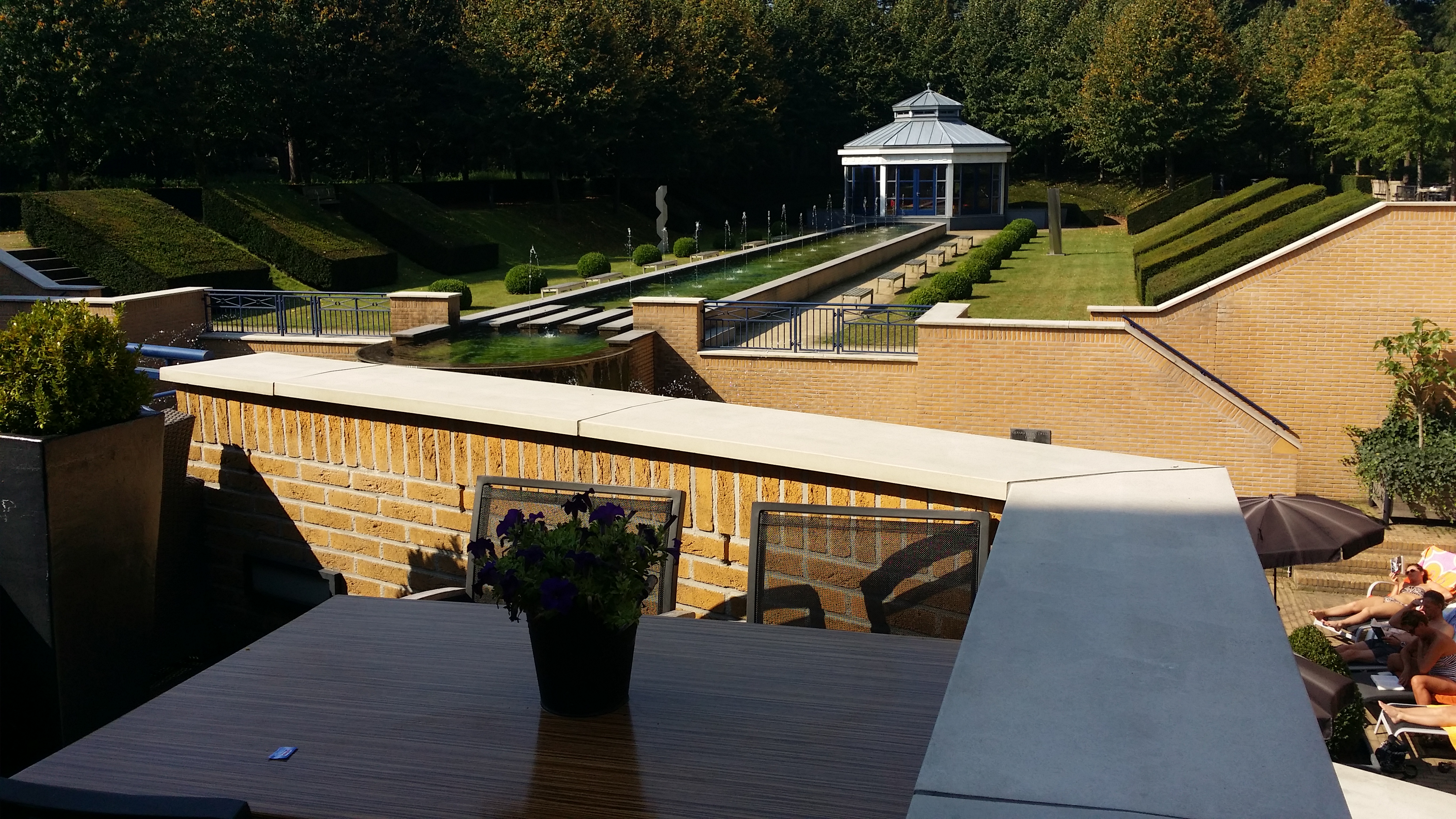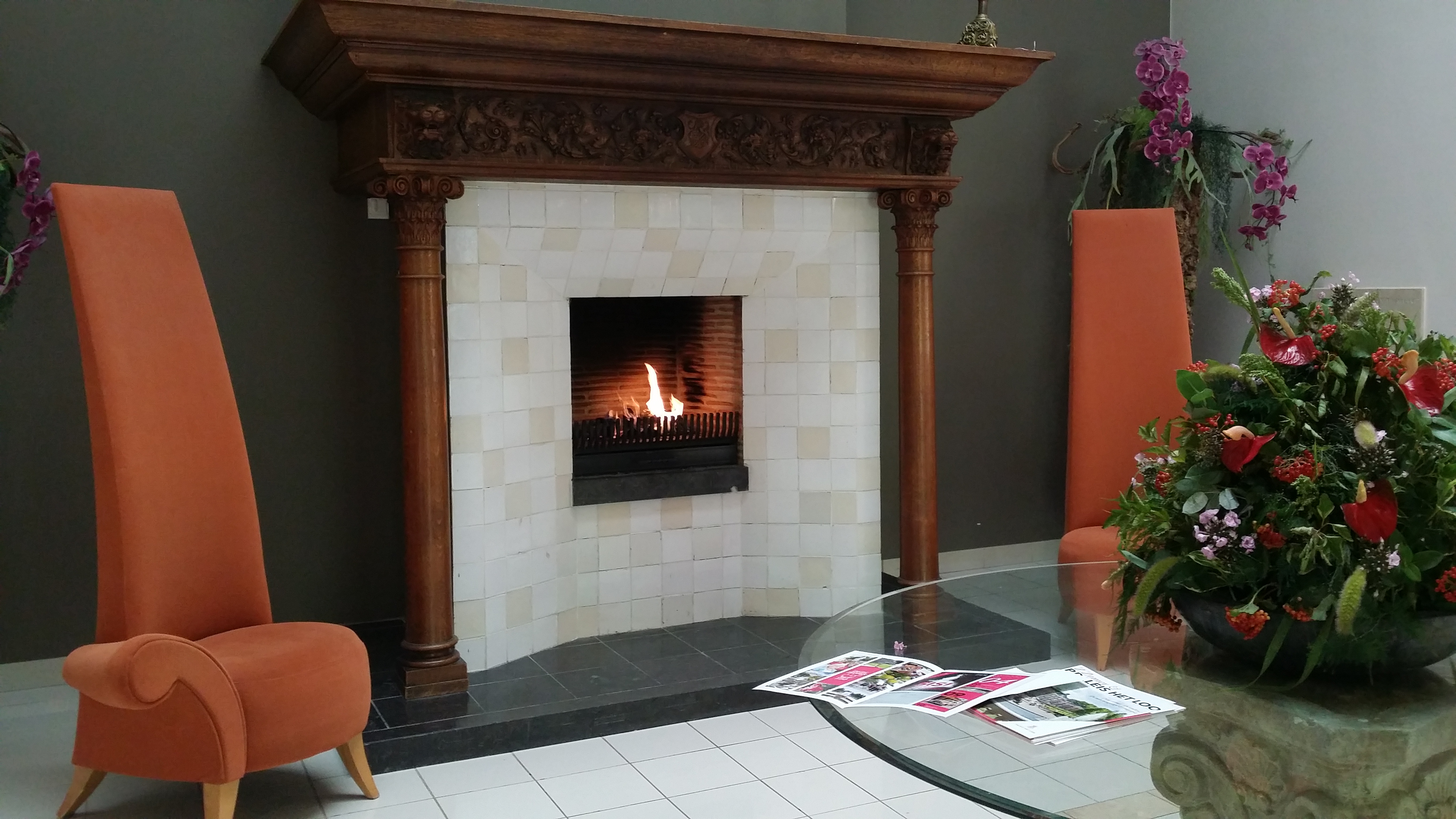 Van de buitenkant is het niet zo heel erg mooi wanneer je komt aanlopen, maar als je de fonteinen ziet en het mooie terras met daarachter het grote zwembad, dan weet je dat je op een goede plek gaat vertoeven. In de lobby is een enorme open haard met Bratz-achtige stoelen, een luxueuze eyecatcher waarvan ik het ietwat overdreven vond dat hij aanstond in hartje zomer, maar aan de andere kant; een pronkstuk in het midden van een kamer moet natuurlijk wel in vuur en vlam staan en er niet stil bijliggen als de gemiddelde Center Parks-open haard (omdat die haardblokken veel te duur zijn!).