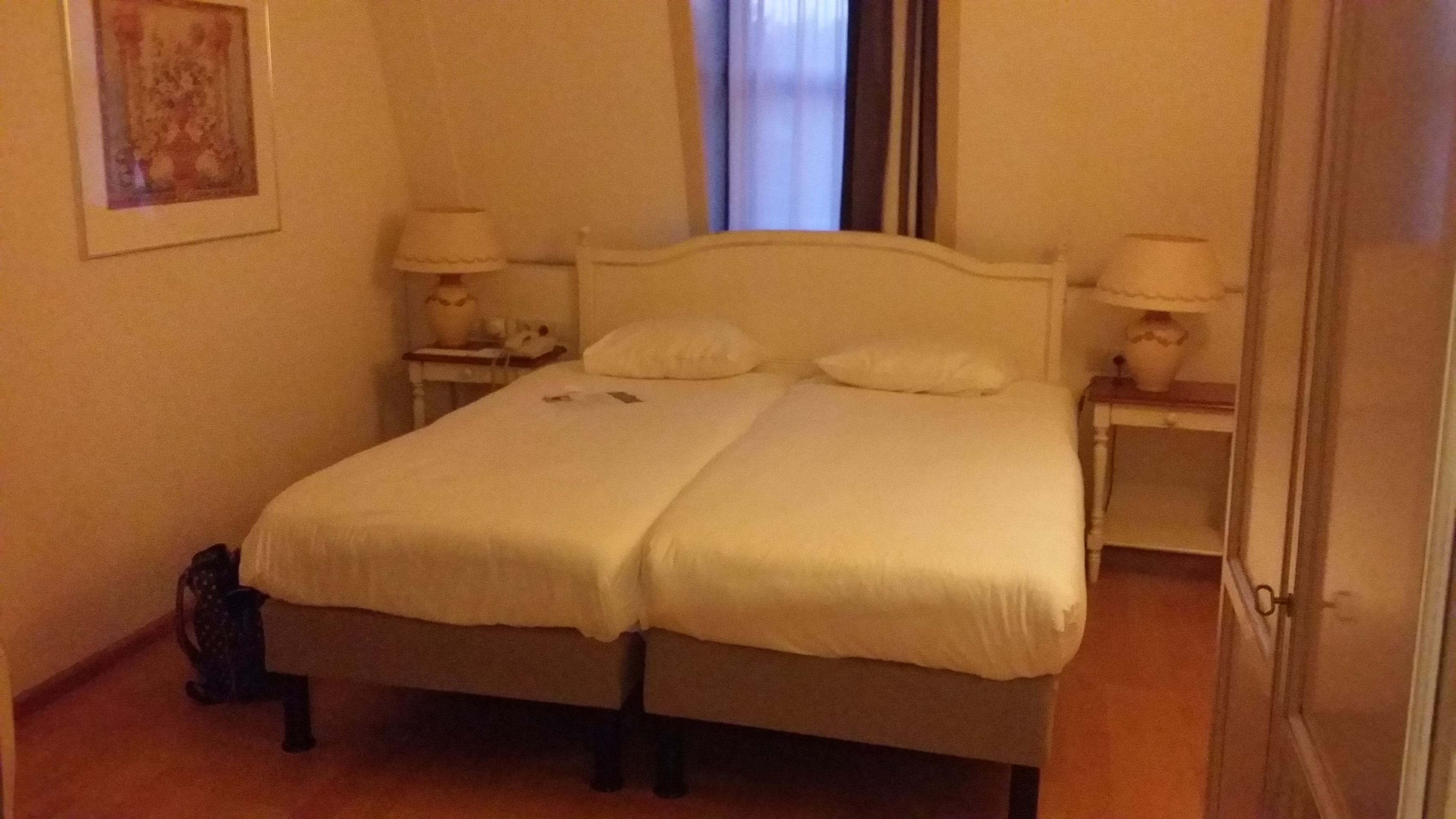 De ontvangst was zeer goed, receptie was welbespraakt en heel netjes, echt de viersterrenbehandeling. Er stonden zelfs Booking.com-awards op de balie, dus dat zat wel goed. Eenmaal op de kamer, die op tweede etage was, moest ik wel lachen om de zogenaamd oude kasten, die overduidelijk nieuw waren maar waren ‘geauthenticiteerd’. Het had wel iets schattigs. Sowieso vond ik de inrichting van de kamer niet heel hotelkamer-achtig, maar wat huiselijker, en dat is erg origineel. We hadden netjes koffie- en theefaciliteiten, een bad in de badkamer en een mooie flatscreentelevisie, dus er was weinig te klagen.