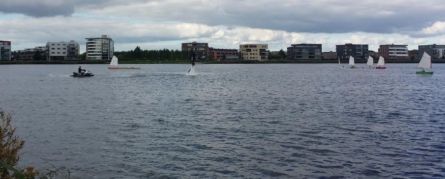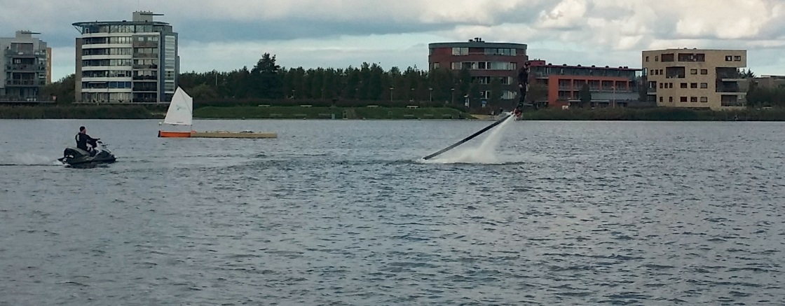 Helaas was het wel even wachten omdat het wat uitliep, maar daarvoor verontschuldigden ze zich. Eigenlijk was dat juist wel leuk, want dan kon je even lekker bekijken hoe anderen het deden en bouwde de spanning voor jezelf ook op. Sommigen gingen twee of drie meter de lucht in, anderen redden slechts een meter en stortten dan weer in het meer. Niet hard hoor, men is immers goed ingepakt en het reddingsvest zorgt ervoor dat je niet kopje onder blijft. Wat ook wel fijn is, is dat het een een-op-een-sport is. Een iemand Flyboard, de begeleider is altijd wel iets van 10 meter in de buurt op een jetski. Die jetski zorgt namelijk voor de aandrijving van de waterstraal onder het Zapata Flyboard, zodat je net als bij een jetpack omhoog wordt gestuwd.