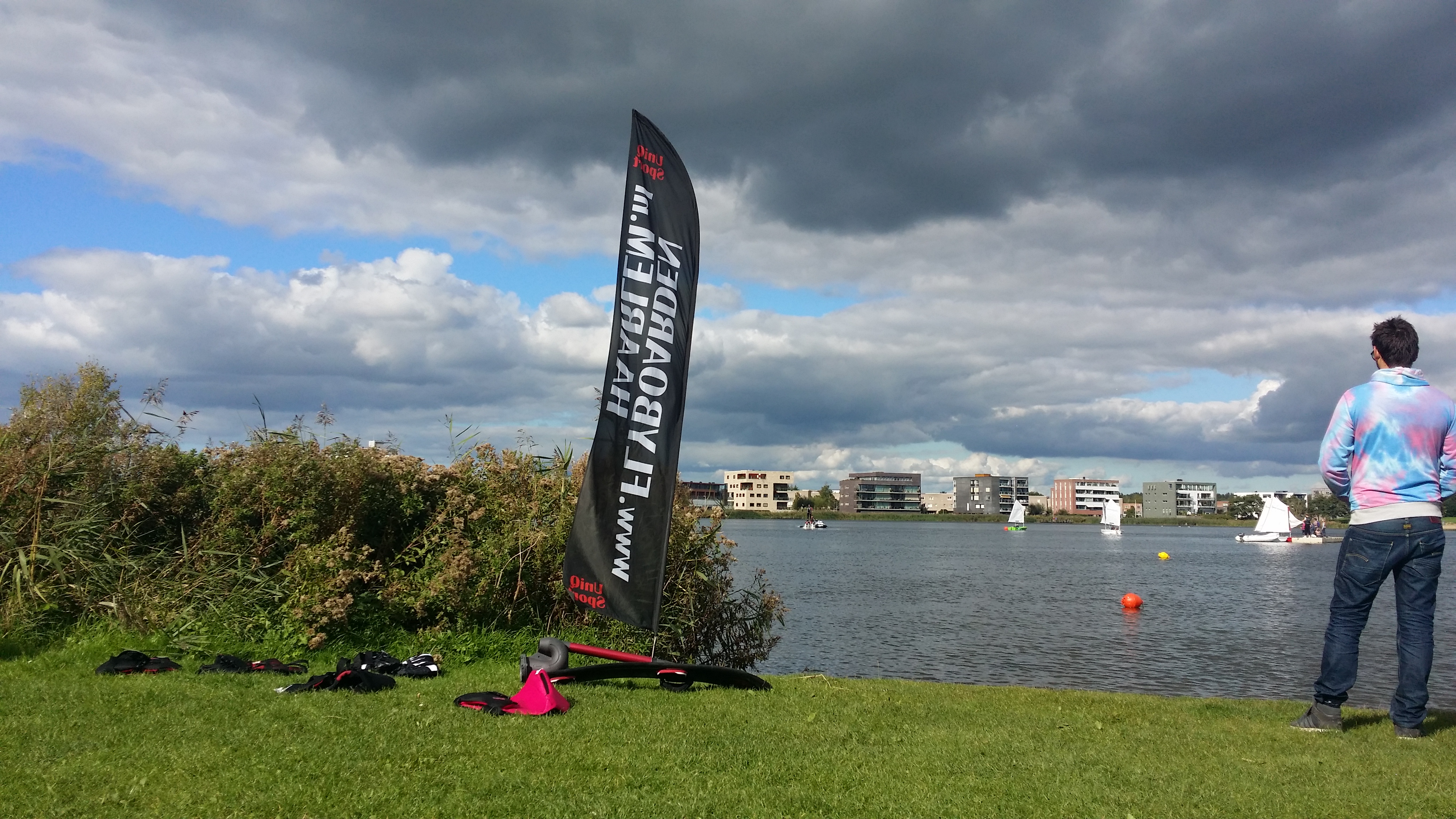 Velsen is een mooi plaatsje, maar met het openbaar vervoer is het wel nog even twintig minuten lopen vanaf de bushalte. Geen ramp, want de omgeving is prachtig en waarschijnlijk loop je het als het weer goed is, anders gaan de activiteiten bij Uniqsport namelijk niet door. Toen ik had geboekt, was dat gelukkig niet het geval, dus konden we genieten van een mooi (laat) lentezonnetje. Tussen een weiland met koeien en het meertje Westbroekplas liepen we naar Uniqsport, wat kort betekent: een blauwe tent om om te kleden en een ministrandje waar de ene na de andere persoon werd meegenomen om te flyboarden.