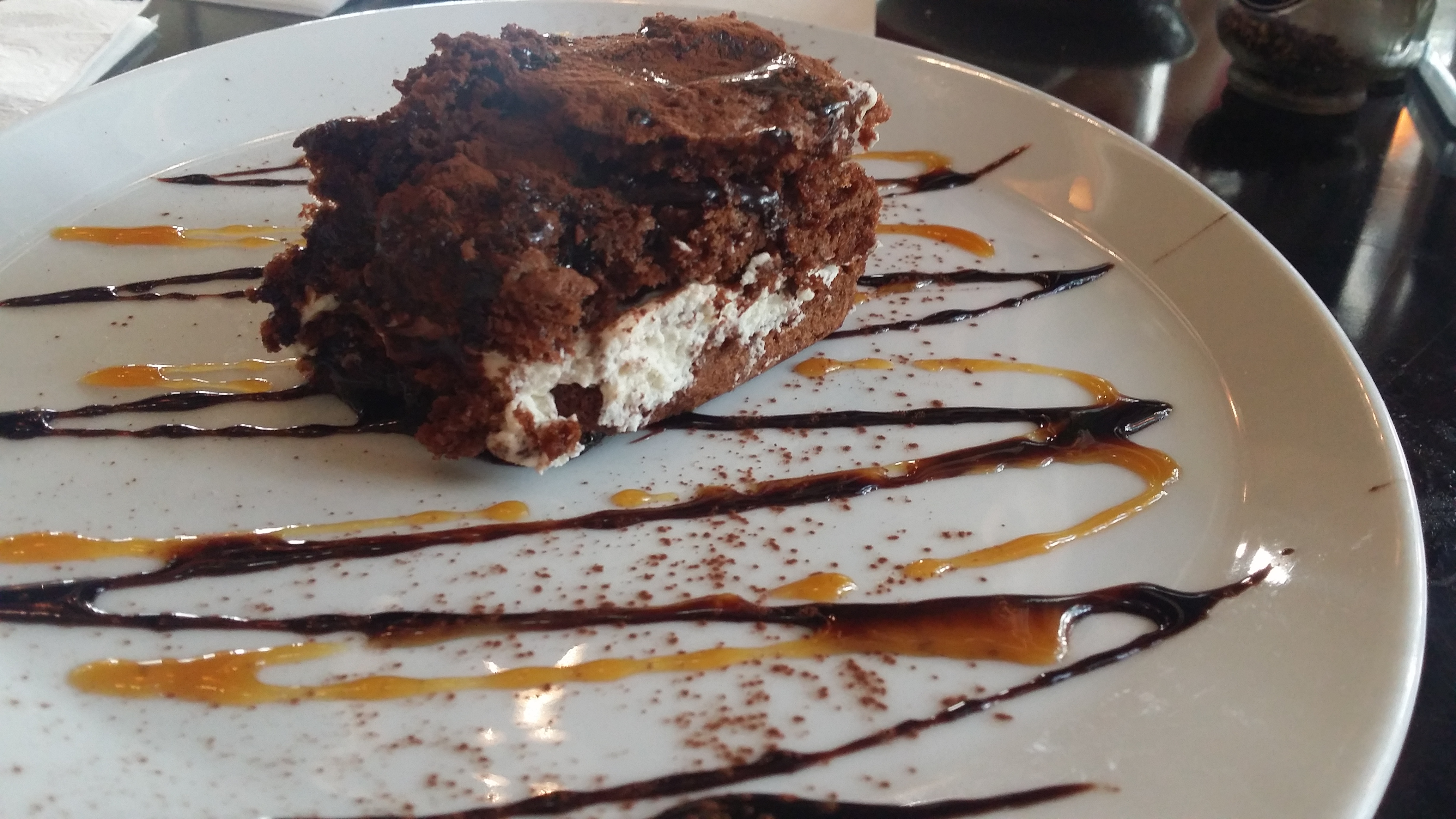 Hoewel ik wel wat vol was, had ik natuurlijk nog een dessertje tegoed. Ik had de chocoladetaart gekozen, maar dat was meer een soort brownie-slagroomgebakje. Ik vond het wel lekker, het was iets wat ik nog nooit eerder op die wijze had gegeten, maar het was niet heel chocoladerig zoals je meestal wel zou verwachten bij een chocoladetaart. De presentatie was wederom erg mooi, dus in dat opzicht is Tot Zo best een goede plek om te eten. Echter komt er helaas toch nog een maar.