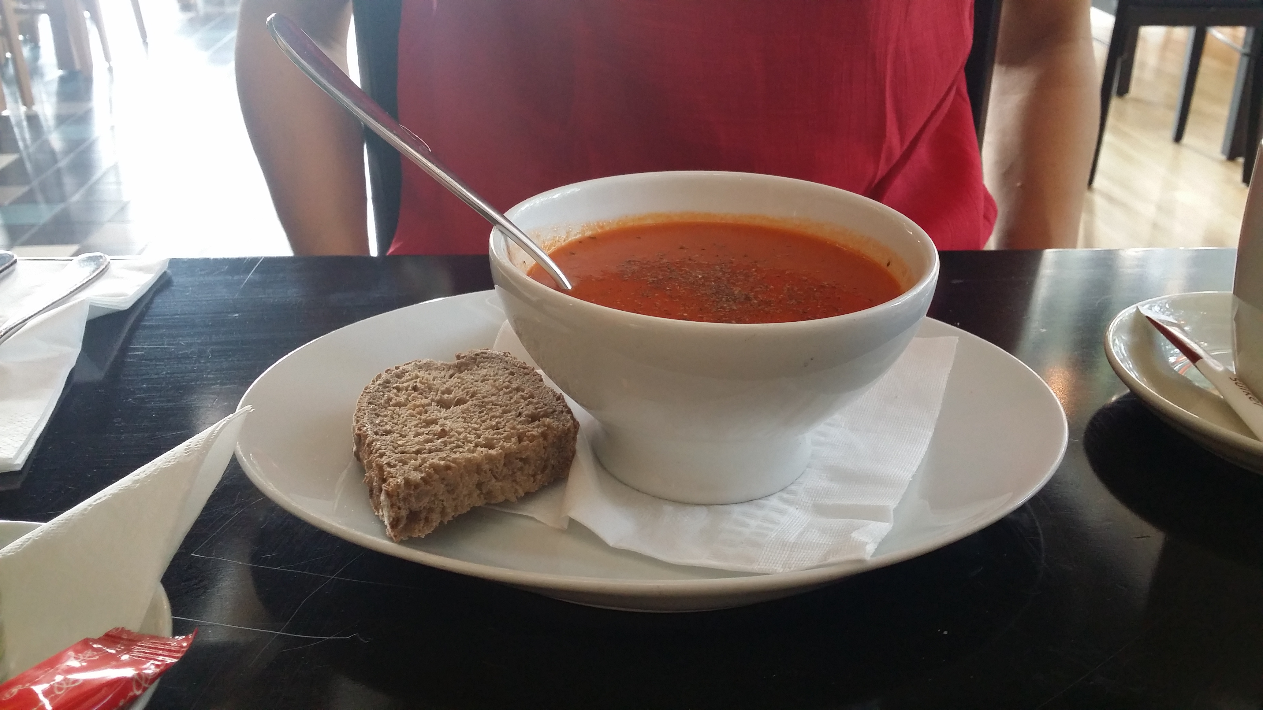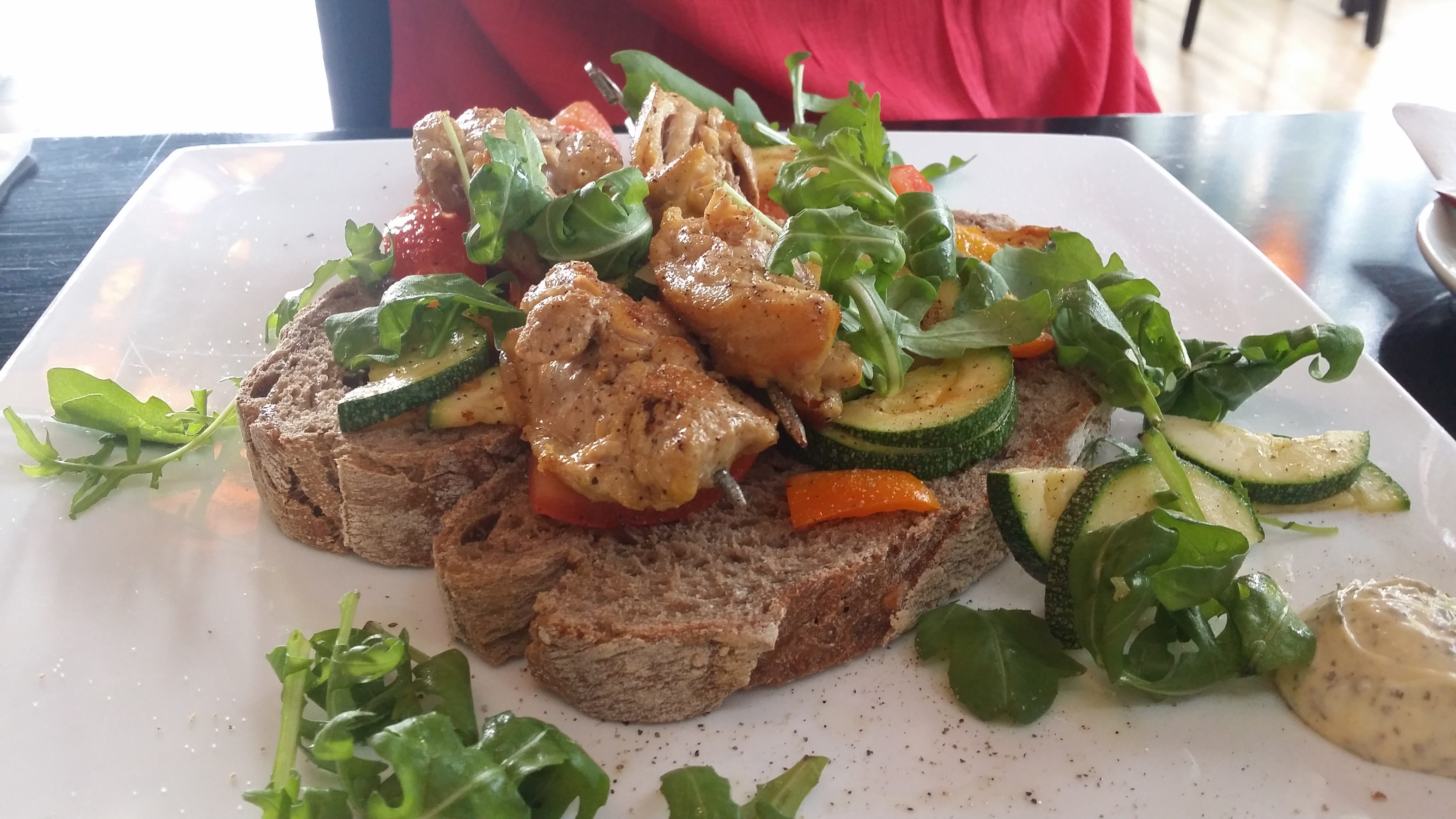 De soep van mijn vriendin was wat gewoontjes, maar wel lekker. Het was ook een grote kom vol, met netjes een stukje brood erbij. Daarna volgden onze broodjes. We hadden allebei eenzelfde soort broodje genomen, met gegrilde groenten, kip of rundvlees en rucola op een mooie dikke snee brood. Erg lekker, alleen vond ik het jammer dat er allemaal ui op mijn brood zat; dat stond niet bij de ingredienten op het menu en aangezien die stukjes overal zaten, moest ik echt alles van mijn brood afvegen en er dan los weer opleggen.