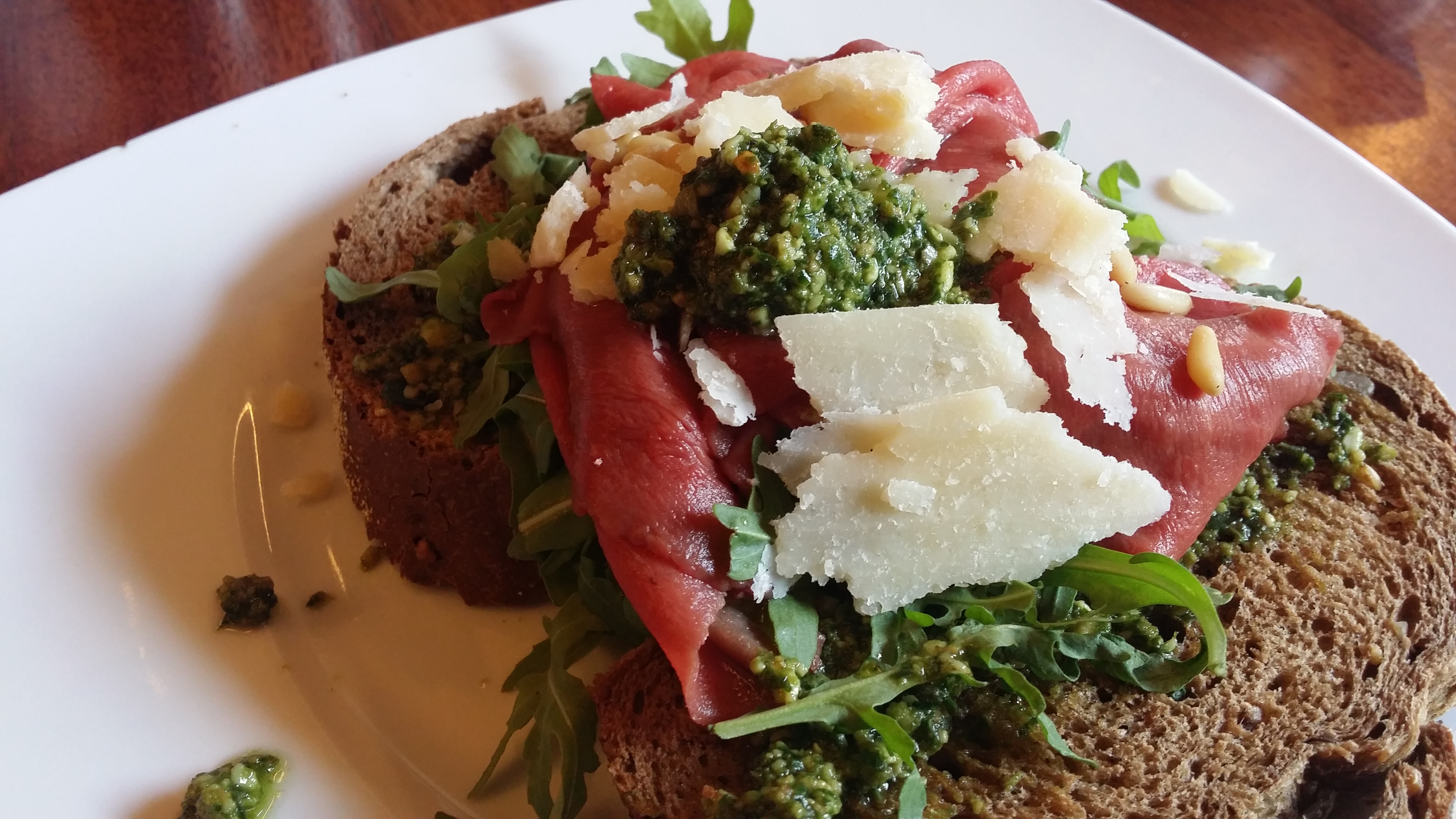 Het broodje was net als mijn broodje bij Tot Zo wel een uitdaging, omdat het een snee brood is met beleg erop. Ga je dan met je bestek moeilijk doen en door de krokante korst heensnijden, of doe je het met je handen? Een beetje van allebei, bleek. Ik vond mijn broodje wel heel erg smakelijk. Ik koos voor de carpaccio, vriendlief ging voor ham. Allebei de broodjes waren erg smakelijk en rijkelijk belegd, dus daarover is niets te klagen. Ik was blij met mijn keuze, hij was blij met zijn keuze, het was alleen de service die tegenviel.
