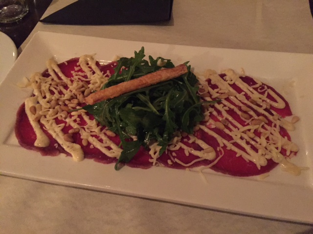 Toen we eenmaal de bestellingen hadden doorgegeven en het voorgerecht voor ons kregen, bleek die wel het wachten meer dan waard. Jullie kennen me inmiddels, ik ging voor de carpaccio, die erg smaakvol was, wel wat heftig qua saus. Mijn partners in crime hadden ook lekkers te smikkelen: een trio van zalm. Zoals je aan de foto’s in dit artikel kunt zien, heeft Aan Tafel vooral een excellente keukenstaff als het gaat om het opmaken van het bord. Het waren stuk voor stuk kunstwerkjes en de smaak was ook nog eens zeer goed.