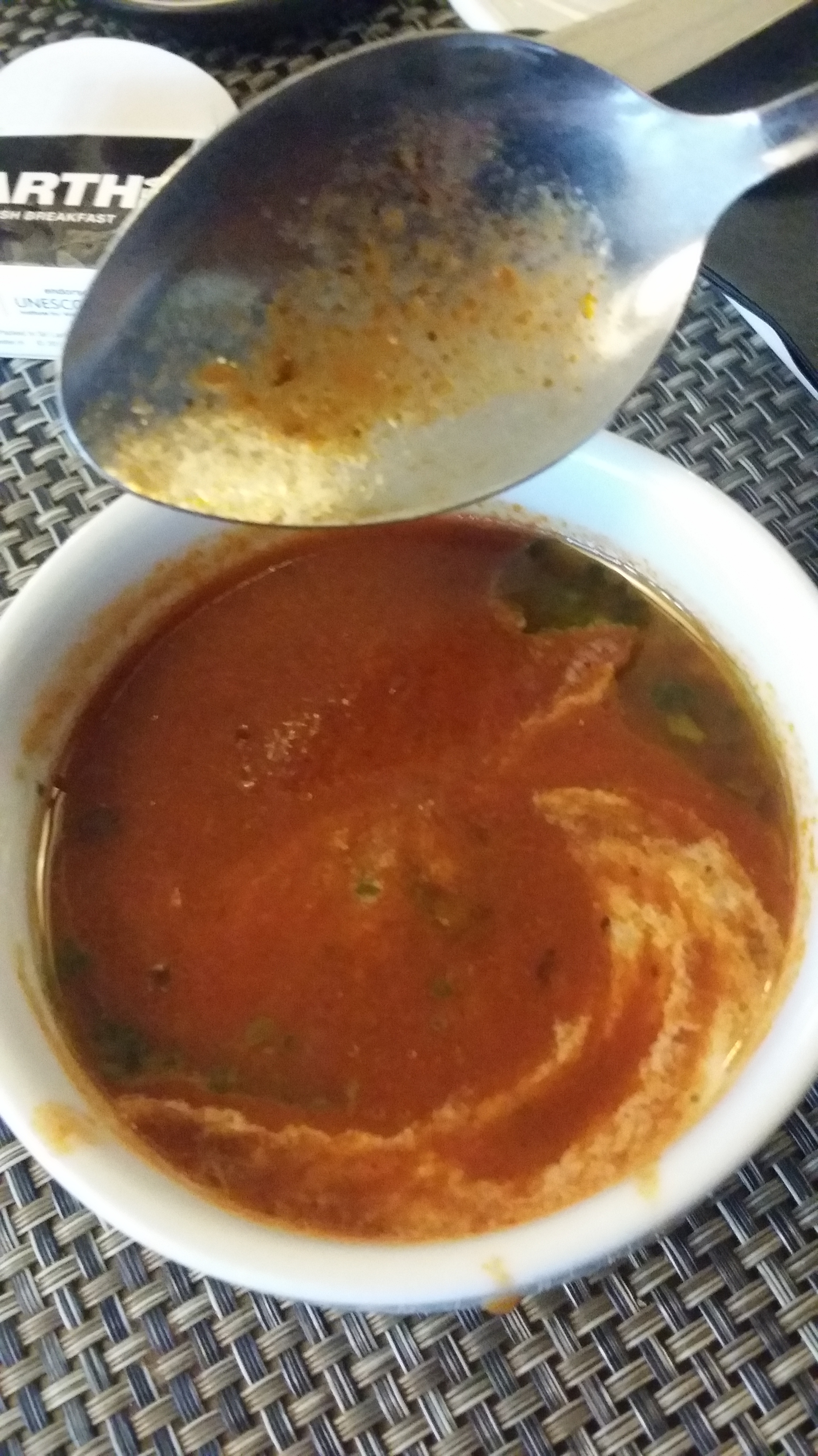 Dat dit eindelijk weer eens een high tea zou zijn zoals high teas bedoeld zijn, werd al duidelijk toen we vooraf een soepje kregen. Net nadat ons een pot heet water was gegeven en we de biologische Earth-thee even lieten trekken, kregen we een smakelijk tomaat-basilicumsoepje als klein voorgerechtje. Een smakelijk, klein kopje soep, dat net genoeg was om in de high tea-smaak te komen. De thee was lekker, maar niet heel erg bijzonder qua smaakjes: de standaard groene thee, rooibos, Engelse thee enzovoorts.