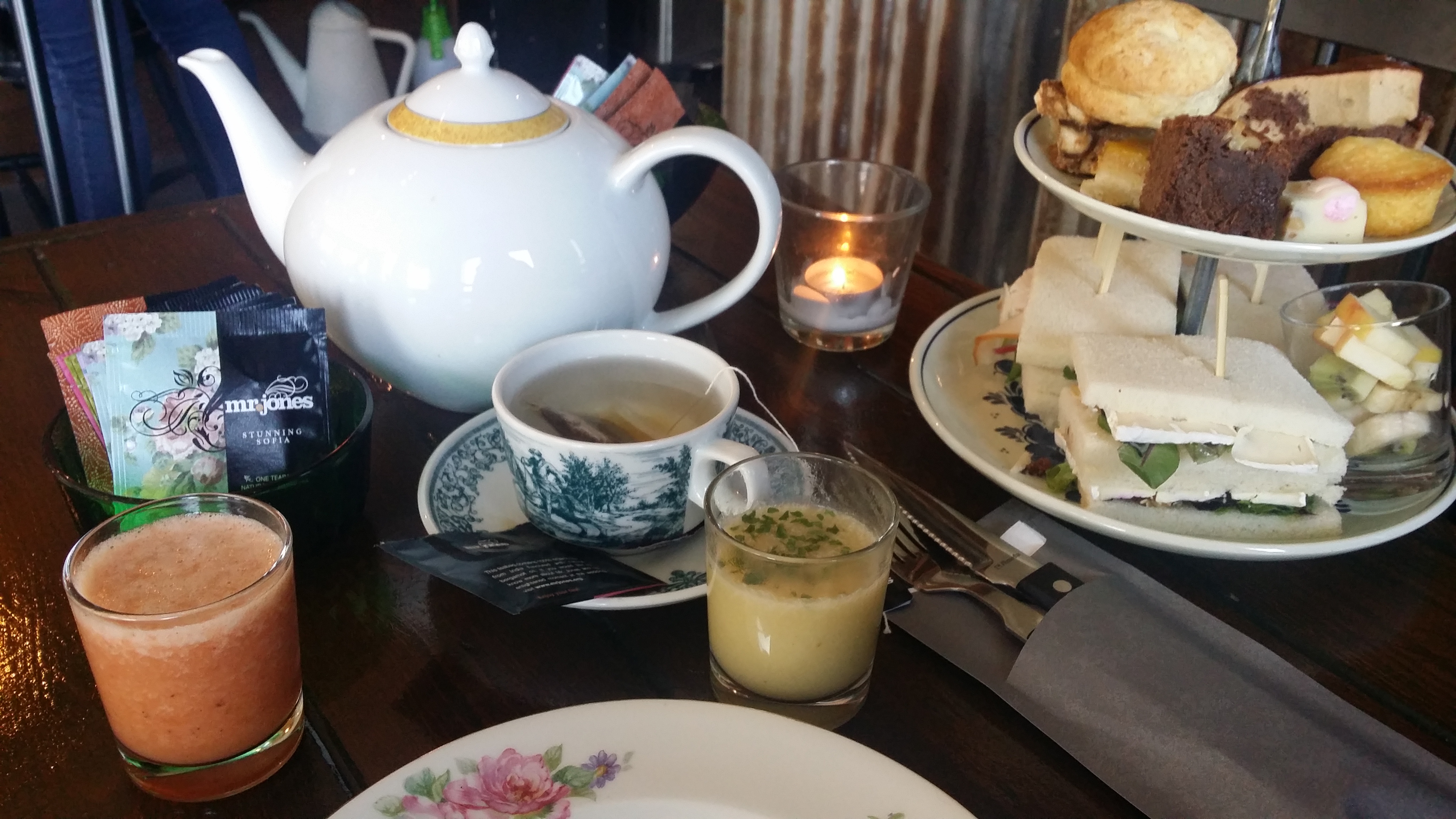 Ik had het helemaal mis. In tegenstelling tot veel high teas die ik heb gedaan, kreeg ik hier netjes het kopje soep dat ik altijd zo goed bij de high tea vind passen (het is net even die extra gang!). Bij Parc388 betekende het een pastinaak soepje, en het smaakte heerlijk. Geen grote kommen vol zodat je al stuffed bent voordat je ook maar een sandwich op hebt; een bescheiden glaasje om net even een lekkere soepsmaak te hebben, voor er aan de etagere werd begonnen. Uiteraard was er ook volop thee aanwezig. Omdat ik slechts alleen was, heb ik het met een pot gedaan, maar in principe was de deal voor onbeperkt thee (van Mr. Jones, dus prima). Bovendien kwam er ook een smoothie/sapje bij de high tea, dus het was een feest voor de nieren.