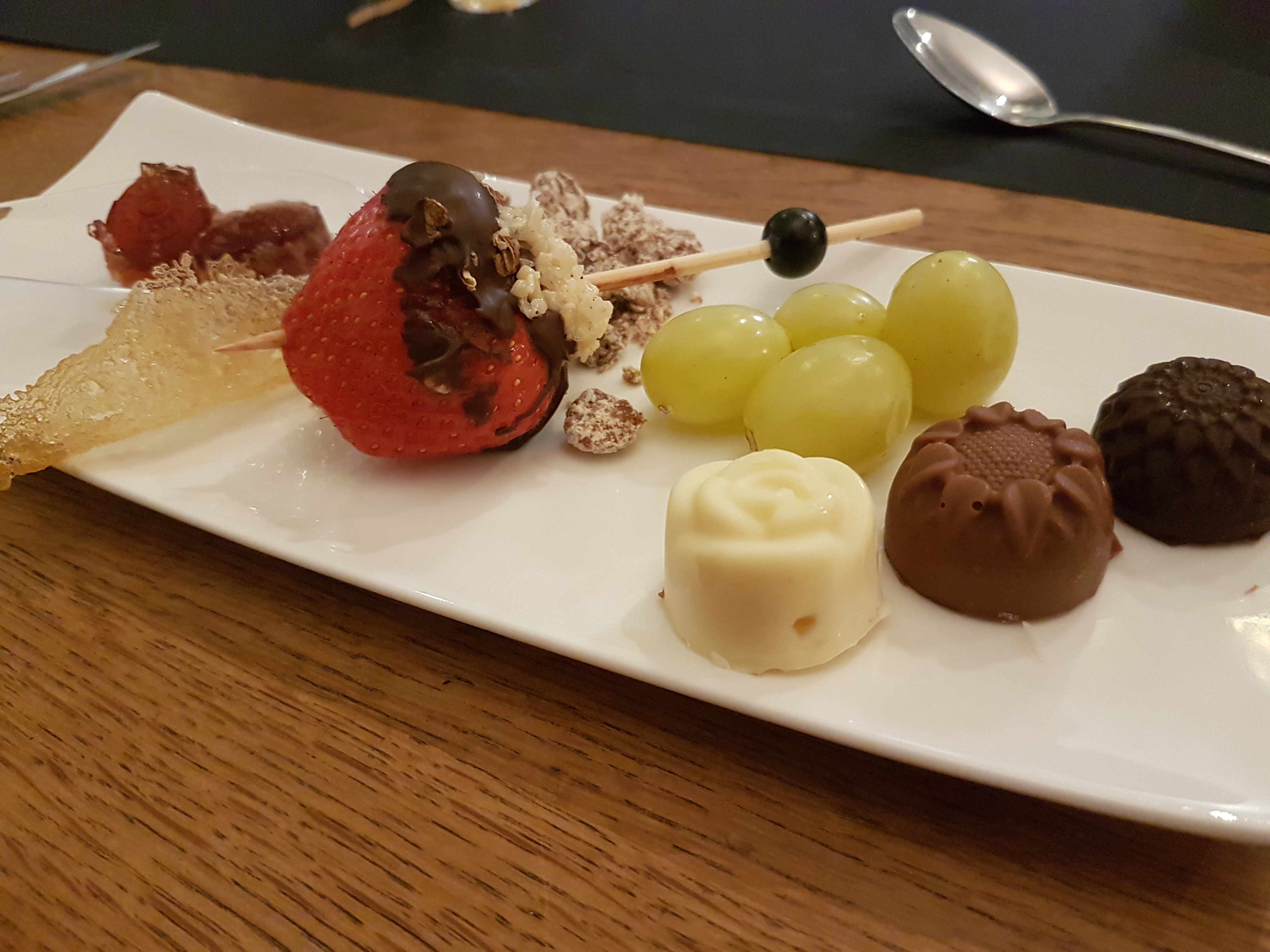 Echter was het uiteindelijk wel weer veel indrukwekkender dan ik bij de uitleg bedacht. Met een groep van 16 man gingen we om half vijf (het begon om 4 uur, maar eerst binnenkomen, uitleg, et cetera) eerst aan het ene blok onze amuse maken: een tzatzikibol, en daarna maakten we parels van caramel, balsamico-azijn en aardbei. Harstikke leuk, want die parels zouden later in het voorgerecht (balsamico) en dessert (zoete parels) voorkomen. Voor het maken van beide dingen werd je per duo aan een snijplank gezet, dus het is verstandig deze workshop met een even getal aan mensen te doen.