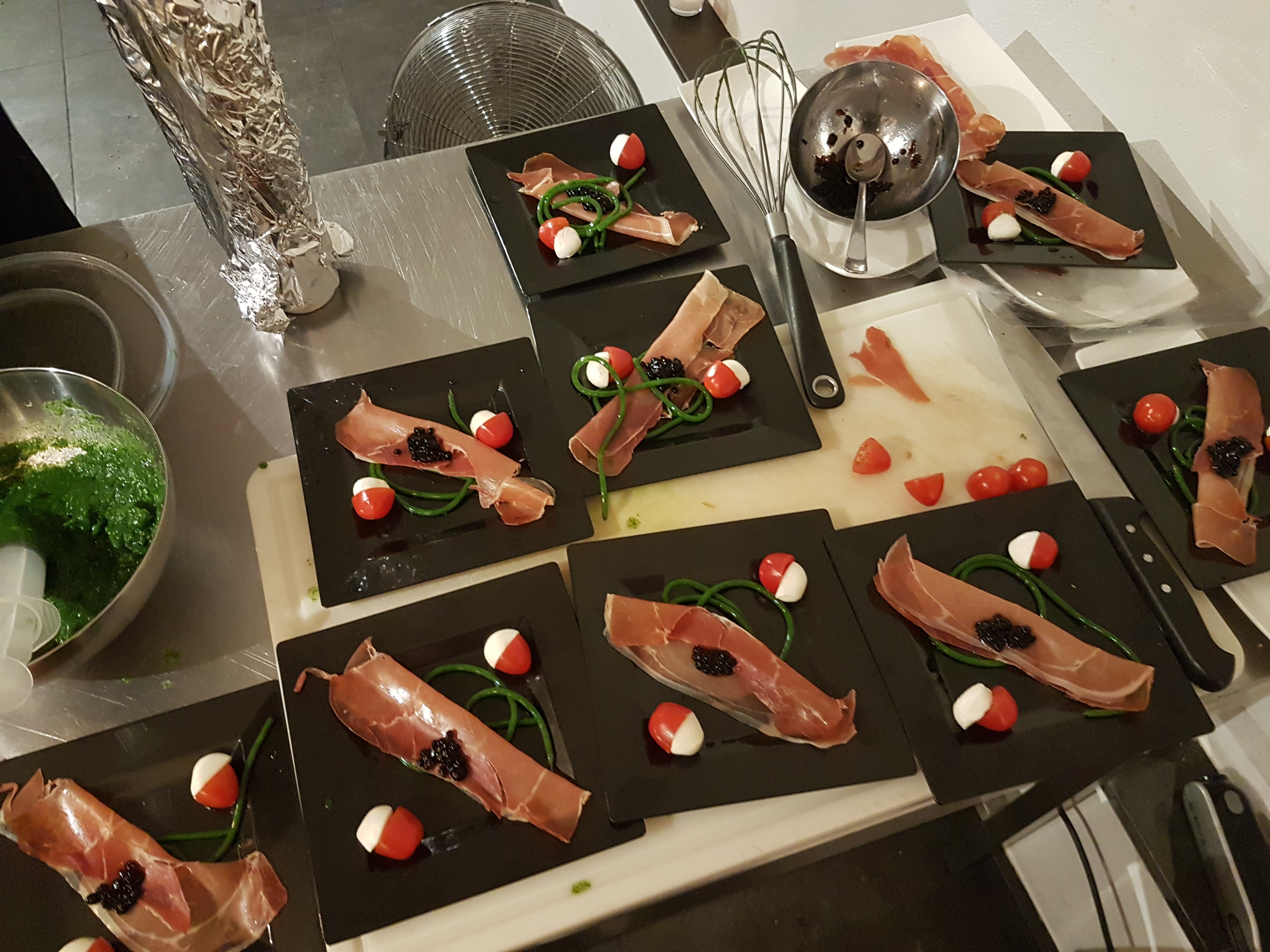 CheapMiep en partner waren verantwoordelijk voor een deel van het voorgerecht, namelijk de rucola-spaghetti, die we moesten maken door rucola tot sap te pureren, te mixen met Agar Agar, en vervolgens met zo’n spuit uit een dokterskoffertje door kleine buisjes te duwen, even in water te houden en met een andere spuit met lucht er weer uit te laten schieten. Het was heel bijzonder hoe rucola ineens in spaghetti werd veranderd, hoewel de spaghetti wel wat plastic-achtiger was dan normaal, was het alsnog erg lekker. Een beetje ham, mozzarella, mini-tomaat en die bascilicumparels erbij en smullen maar!