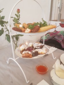 Het eten wat vervolgens kwam was erg lekker en er werd perfect rekening gehouden met dieetwensen. We kregen een heerlijke spinaziequiche, loempia’s, een stokje met tomaat-mozzarella-bascilicum en falafelschijfjes. Het was allemaal erg lekker en werd gepresenteerd op een grote etagere, zoals het hoort. Een vreemde combinatie is het natuurlijk wel: we reisden de hele wereld rond met al die gerechtjes. Normaliter zou ik dat dan ook niet heel erg waarderen bij een high tea, maar ik vond het in dit geval eigenlijk wel grappig. Bovendien waren we al tegen het avondeten aan, dus het paste prima.