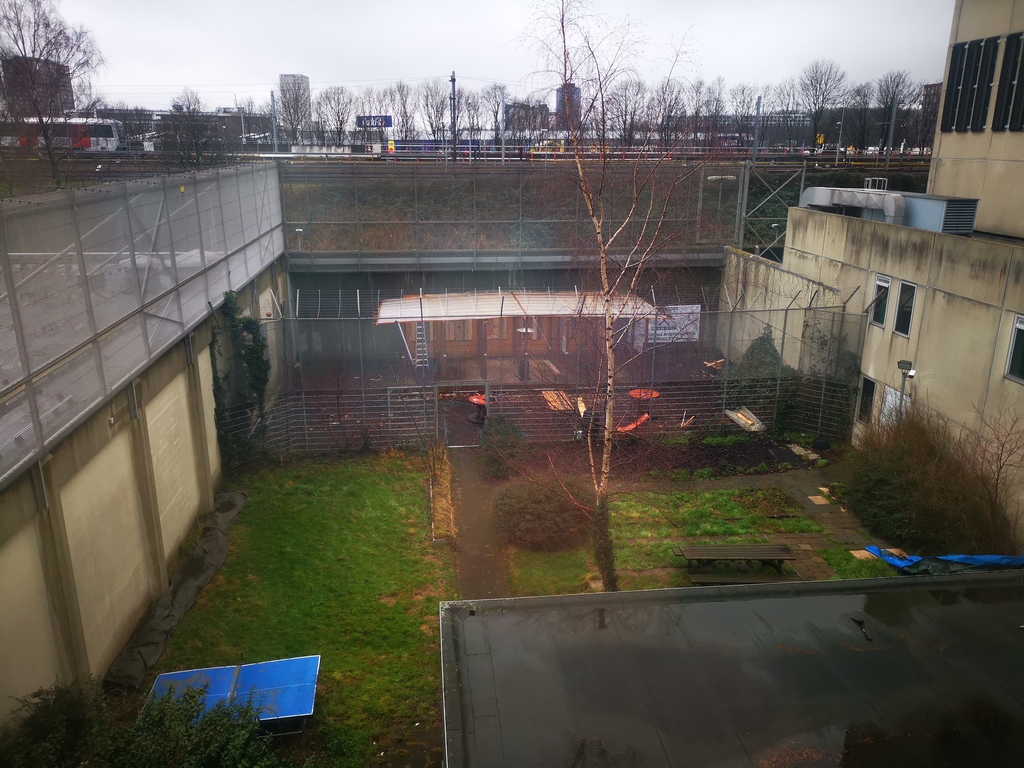 Het is wel even zoeken in de Bijlmer Bajes, want het staat niet geweldig goed aangegeven: maar als je binnenkomt dan is het links bij de gelige tegels. Het is eigenlijk op een soort buitenplaatsje van de oude gevangenis, dus houdt er rekening mee dat je je wel warm kleedt: het is buiten. Er is wel een terrasverwarmer en je wordt ook wel warm van het bijlgooien, maar wees je dus bewust van het feit dat je niet lekker binnen staat.