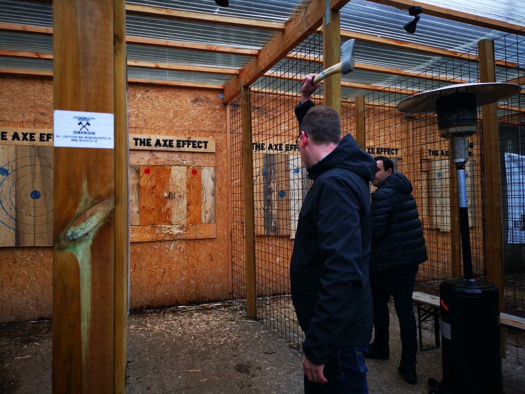 Het grappige is dat het er heel makkelijk uitziet, maar dat helemaal niet is. Als je eenmaal snapt hoe het werkt, dan kun je redelijk gericht op de bullseye proberen te gooien, maar voor mij was het vooral een prestatie als ik de bijl er zo inkreeg dat hij ook daadwerkelijk in de houten muur bleef hangen. Kortom: het is echt niet zo vanzelfsprekend dat je het goed kan, al was ik -zeker vergeleken bij de anderen uit mijn vriendengroep- wel écht heel slecht hoor.