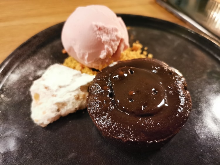 Het dessert was ook geen tegenvaller: ik had uiteraard het chocoladedessert en mijn eet-partner-in-crime ging voor de caramel shortcake, waar hij het dagen later nog over had. Die was dus wel in de smaak gevallen. Zodanig, dat ik niet eens een hapje heb gekregen. Dat hoefde ook niet zo nodig hoor, ik vermaakte me prima met de zachte chocolade van het lavataartje. Verrukkelijk.