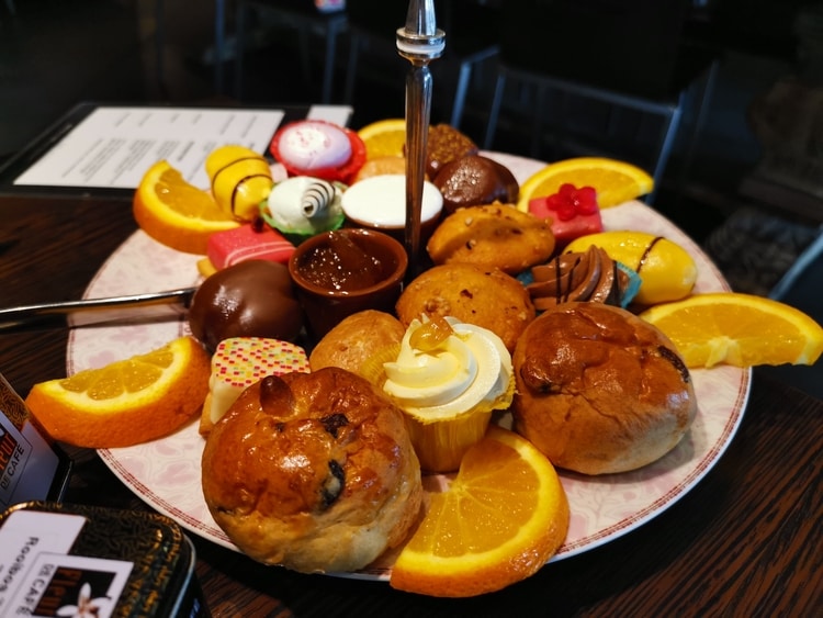 Datzelfde geldt voor de tweede en laatste ronde van de high tea. De scones met clotted cream (dat meer naar slagroom smaakte) waren erg lekker: warm en zacht en lekker met rozijnen/krenten. Ze roken ook heerlijk, dus daar werd ik erg blij van. Het was een flink bord zoetigheid. Er waren een soort petitfours, mini-muffins, eclairs en soesjes. Allerlei schattige kleine lekkernijen in allerlei kleuren. En veelal mierzoet, waardoor we het niet allemaal hebben opgekregen. Hoewel het allemaal erg lekker was, zou ik graag zien dat Enjoy liever iets minder, maar wel iets meer huisgemaakts zou aanbieden, want de dingen die wel huisgemaakt leken, waren hartstikke lekker.