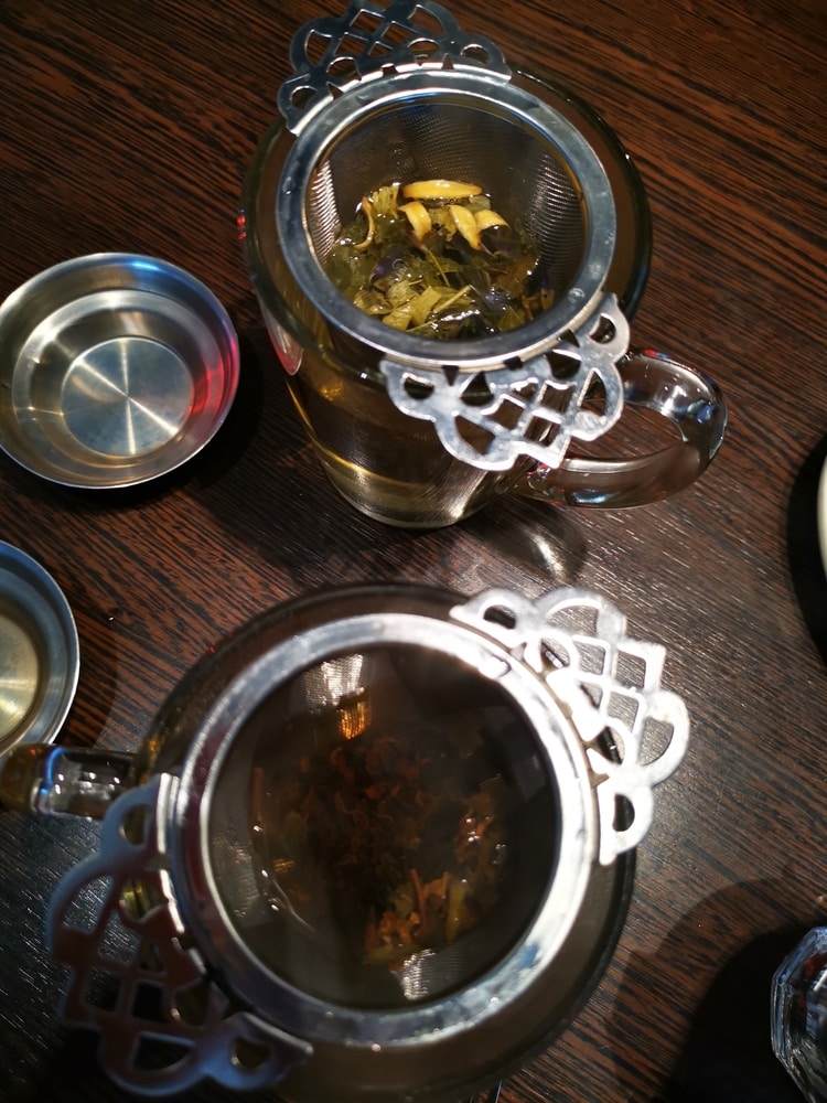 Op het terras zat de eigenaresse, die af en toe binnenkwam om de boel aan te sturen. Zo gaf ze redelijk luid aan dat de dames nu echt eens de ‘stamtafel’ moesten gaan opruimen en riep ze ‘terras!’ naar binnen toen er mensen blijkbaar al een tijdje geleden hadden plaatsgenomen op het buitengedeelte van het restaurant. Het was wel een gewaarwording, die eerste vijf minuten van onze high tea. Daarna werd het echter ook wat betreft de eigenaresse of manager wat rustiger, dus konden we lekker in alle rust genieten van de lekkere thee (van Fleur de Café, dus mooie, losse thee).