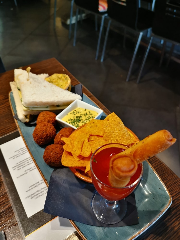 Onze serveerster, die ons voortreffelijk hielp, vroeg netjes of we bekend waren met de high tea en of we al klaar waren voor onze eerste ronde. Dat is de hartige ronde en we hadden wel trek, dus nadat ik had gevraagd of goed was doorgekomen dat ik vegetariër ben, kwam inderdaad een eerste ronde met allemaal vegetarisch lekkers. Naast de sandwich met kaas en pesto was dat niet heel traditioneel, maar wel lekker: kaastengels, bitterballen, een pasteitje en nachochips. Het waren zeker niet allemaal dingen die men huisgemaakt had bij Enjoy, maar het smaakte goed.